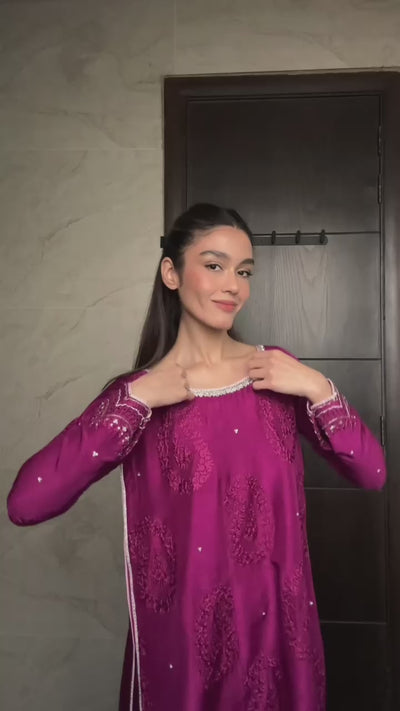This enchanting fuchsia ensemble is crafted from luxurious embroidered raw silk, adorned with intricate silver sequins, bugle beads, naqshi, and gota embellishments around the neckline and sleeve cuffs. The refined detailing adds a subtle shimmer, enhancing the outfit’s timeless appeal. It is paired with elegant palazzo pants featuring delicate gota accents, creating a harmonious and graceful silhouette. Completing the look is an embroidered chiffon dupatta, radiating classic charm with its airy elegance. Perfect for weddings, festive celebrations, and formal soirées, this design blends sophistication, tradition, and understated glamour.