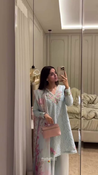 Radiate cooling elegance this season with our Ice Blue 3-Piece Lawn Ensemble. This set features a sleeveless, mid-length tunic meticulously detailed with all-over eyelet schiffli embroidery and a graceful V-neckline finished with delicate lace trimmings. The shirt is anchored by vibrant pink floral embroidery at the hem, providing a stunning contrast to the soft blue base. Complementing the tunic are matching culottes and a lightweight, ethereal printed silk dupatta that showcases a lush, digitally printed floral motif in romantic shades of rose and magenta.