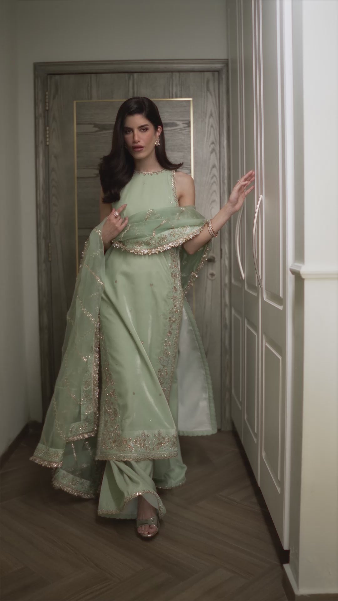 This Pastel Mint velvet ensemble exudes subtle glamour and refined femininity. The sleeveless silhouette features a graceful high neckline embellished with delicate beadwork, creating a soft, ethereal frame around the shoulders. The luxurious velvet fabric falls beautifully, offering a smooth, uninterrupted drape that highlights its rich sheen. Light hand-embellished motifs are scattered across the front, adding a touch of sparkle without overwhelming the look. The outfit is paired with an intricately embroidered organza dupatta, adorned with detailed floral patterns and shimmering accents along the borders, enhancing its sophisticated charm. Perfect for festive occasions and evening events, this design blends soft pastel elegance with timeless luxury, creating a look that is both modern and effortlessly graceful.
